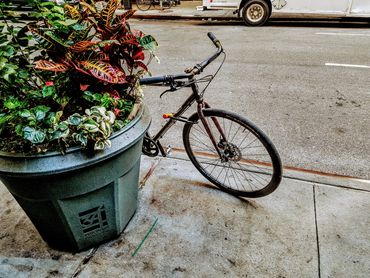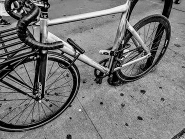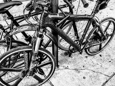 The beater bike. An essential Downtown New York City commuting tool that needs to be useful, yet undesirable. These bikes are heavy and purposefully dumbed down with electrical tape, stickers, dints and rust to appear less attractive to would-be thieves. Heavy gauge hi-tensile steel chains bind these rusted and beaten bikes to city infrastructure, creating a visual canvas of NYC biking culture.
